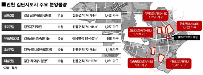 4일 업계에 따르면 연말까지 인천 검단신도시 공급 아파트는 5개 단지 5943가구다. 금호건설(1452가구) △우미건설(1257가구) △호반건설(1168가구) △대방건설(1281가구) △유승종합건설(938가구)이 건설한다.