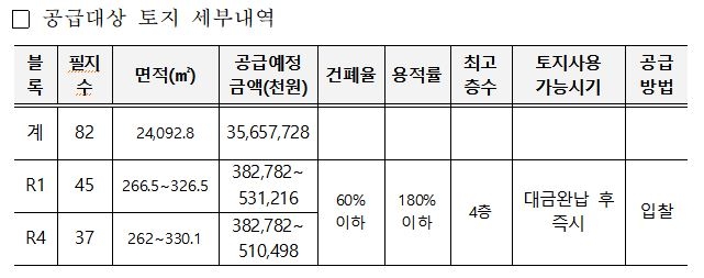 공급예정금액은 3.3㎡당 469~559만 원 수준이다. 공급방식은 최고가 입찰을 통해 계약자를 결정한다.