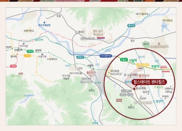 힐스테이트 펜타힐즈는 행정구역상 경산시지만, 대구 수성구 시지동과 경계를 접하고 있어, 수성구의 생활인프라를 공유할 수 있다.