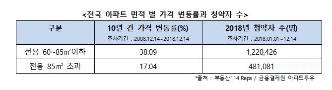 부동산114 자료에 따르면, 지난 10년간 전국의 아파트값 변동률을 확인한 결과 중소형 면적(전용 60~85㎡ 이하)의 가격변동률은 38.09%를 기록했다. 같은 기간 중대형 아파트의 변동률은 17.04%로 2배가 넘는 차이를 보였다.