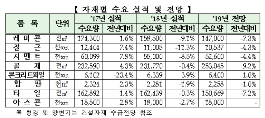 자재별 2018년 수요실적을 살펴보면 철근이 전년 대비 11.3% 감소로 가장 크게 줄어들었으며 레미콘 9.1%, 시멘트 8.5% 등 전반적인 수요 감소가 발생했다.