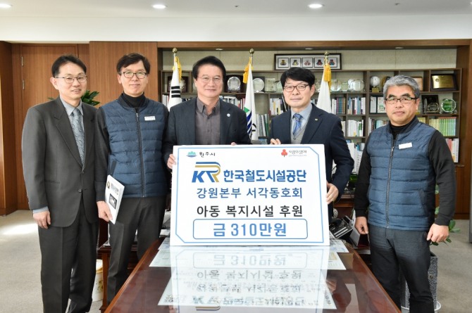 이미지 확대보기한국철도시설공단 강원본부는 서각동호회가 지난해 12월11일부터 31일까지 진행한 전시회를 통해 마련한 수익금 전액을 지역사회 소외이웃에게 기부하기 위해 원주시청에 전달했다고 7일 밝혔다.