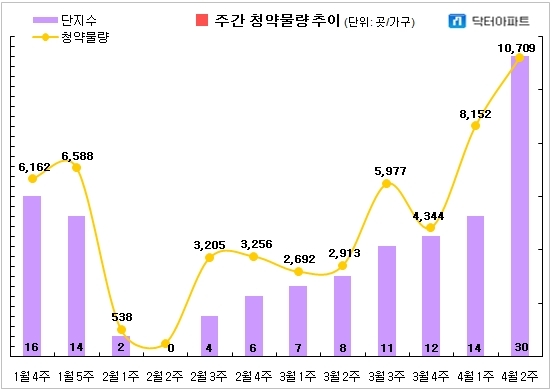 13일 부동산 리서치회사 닥터아파트에 따르면, 4월 셋째주 청약물량은 7곳 2278가구다. 견본주택은 10곳이 문을 열고 당첨자 발표는 11곳, 당첨자 계약은 15곳이다.