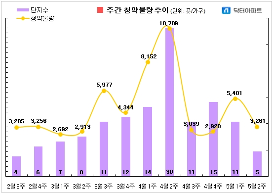 이미지 확대보기4일 부동산 리서치회사 닥터아파트의 5월 둘째 주(6~11일) 청약 일정에 따르면, 전국의 청약접수 물량은 5곳 3261가구이다. 견본주택 공개는 7곳이며, 당첨자 발표 4곳, 당첨자 계약 9곳이 진행될 예정이다.