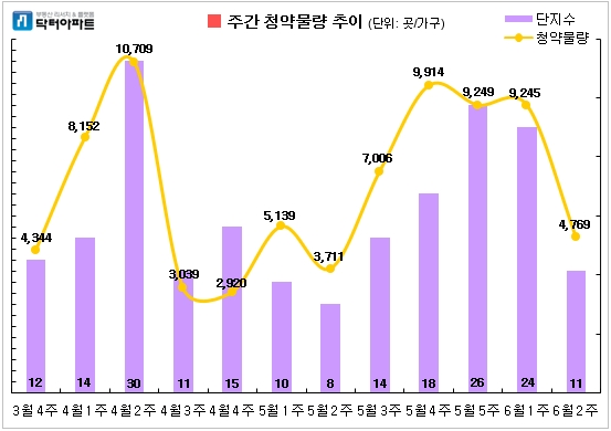 이미지 확대보기7일 부동산 리서치회사 닥터아파트에 따르면, 6월 둘째 주(6월 10~15일) 청약물량은 11곳 4769가구이며, 견본주택 개관은 9곳이 예정돼 있다. 당첨자 발표는 28곳, 당첨자 계약은 17곳이다.