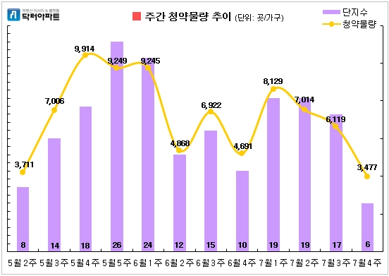 이미지 확대보기20일 부동산 리서치 회사 닥터아파트에 따르면, 7월 넷째주(7월 22~27일)에는 전국 6곳에서 3477가구가 분양에 들어간다. 당첨자 발표는 13곳, 당첨자 계약은 22곳이며, 견본주택은 11곳에서 선보인다.