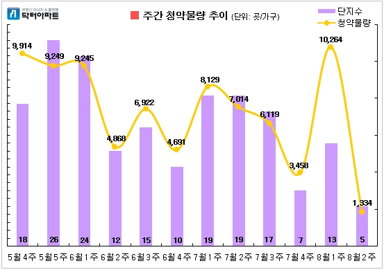 이미지 확대보기3일 부동산 리서치회사 닥터아파트에 따르면, 8월 둘째주(8월 5일~8월 10일) 전국의 청약물량은 5곳 1334가구이며, 견본주택을 여는 단지는 3곳이다. 당첨자 발표는 11곳, 당첨자 계약은 14곳이다.