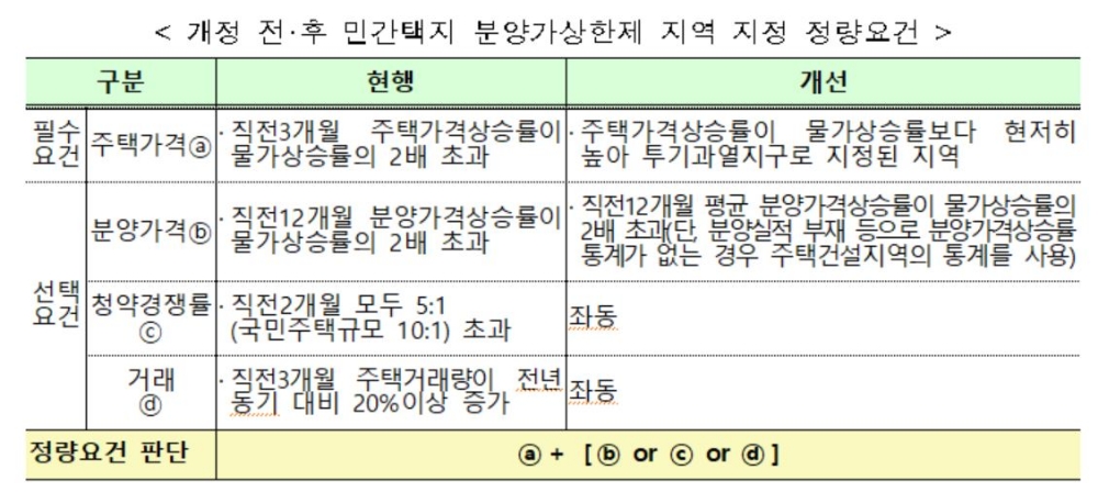 또한 선택 요건 중 하나인 분양가격 상승률은 해당 시·군·구의 분양 실적 등이 없어 활용되지 못하는 경우가 많아 해당 시·군·구의 분양 실적이 없는 경우에는 ‘주택공급에 관한 규칙’ 상 청약이 가능한 지역인 주택건설지역(특·광역시)의 분양가격 상승률을 사용하도록 개선한다.