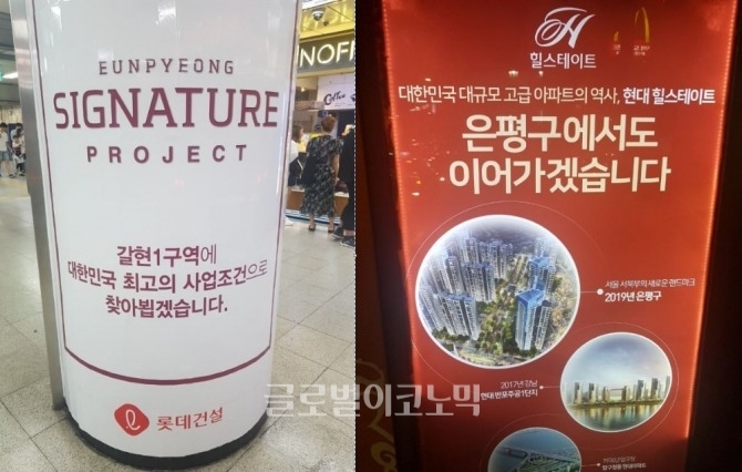 서울지하철 3호선 연신내역과 갈현동 인근 버스정류장에 설치된 현대건설과 롯데건설의 갈현1구역 재개발 광고판. 사진=김하수 기자