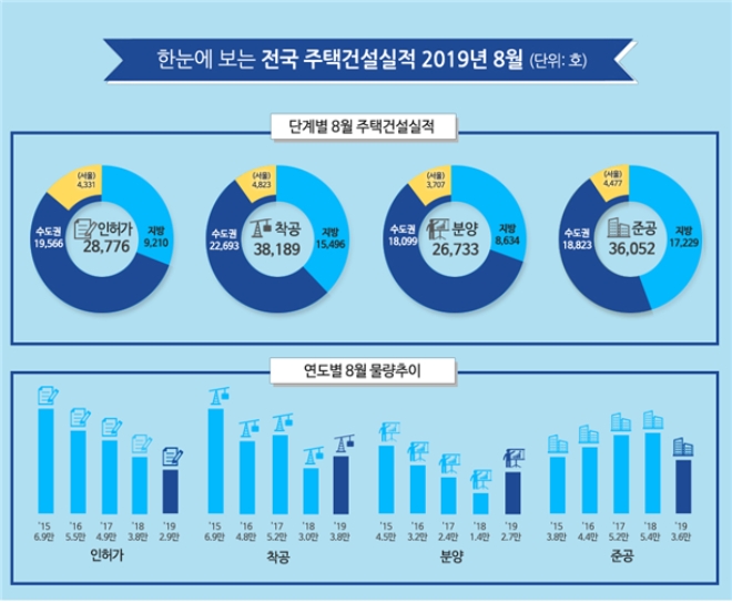 8월 주택 착공실적은 전국 3만8189가구로 전년 동기(3만393가구) 대비 25.7% 증가했다. 수도권은 2만2693가구, 지방은 1만5496가구로 각각 7.5%, 6.1% 늘었다. 서울은 4823가구로 7.5% 증가했다.
