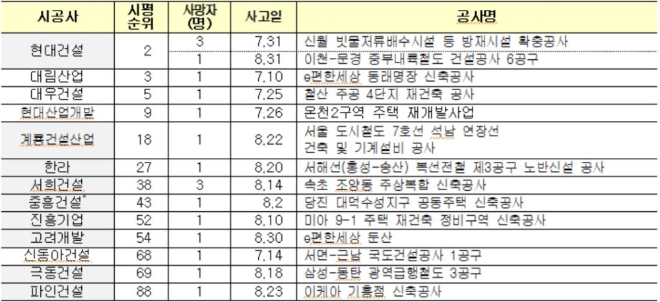 이미지 확대보기국토교통부는 4일 시공능력평가(시평) 상위 100위 건설사 중에서 지난 8월 한 달 동안 사망사고가 발생한 회사의 명단을 공개했다. 시평 상위 100위 중 9개 건설사에서 8월 중 총 11명의 근로자들이 현장사고로 숨진 것으로 집계됐다.