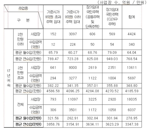 기준시가 9억 원을 넘는 고가주택 소유 전업 임대사업자가 793명으로 36명 늘었고, 이들의 한 달 평균 수입은 321만 원, 연 수입은 3858만 원으로 근로자 평균 3541만 원을 보다 많은 것으로 나타났다.