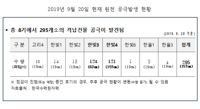 이미지 확대보기14일 국회 산업통상자원중소벤처기업위원회 소속 더불어민주당 위성곤 의원(제주 서귀포)이 한국수력원자력(한수원)으로부터 받은 '원전 격납건물 공극발생 현황' 자료에 따르면, 지난달 20일 현재 격납건물 공극은 총 295개로 조사됐다.