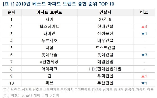 조사 결과 GS건설 ‘자이’가 3년 연속 종합 1위 자리를 차지했고, 현대건설 ‘힐스테이트’가 2위를 기록했다. 이어 삼성물산 ‘래미안’, 대우건설 ‘푸르지오’, 포스코건설 ‘더샵’이 뒤를 이었다. 중견건설사 중에서는 우미건설의 ‘린’과 두산건설 ‘위브’가 10위권 안에 이름을 올렸다.