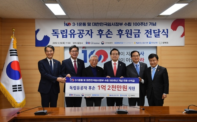 조폐공사는 19일 서울 종로구 정부서울청사 3층 대회의실에서 판매 대행기관인 농협, 우리은행 등과 함께 조성한 1억 2000만 원을 독립유공자 대표 단체인 광복회에 후원금으로 기탁하는 전달식을 가졌다.