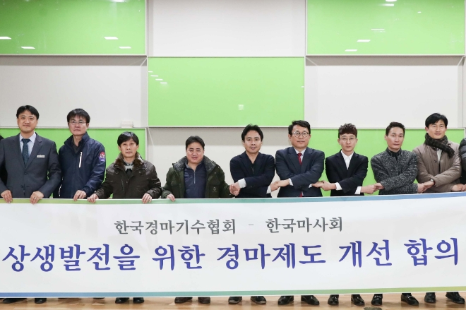 이미지 확대보기마사회는 26일 오후 경기도 과천시 기수협회회관에서 경마기수협회와 '경쟁성 완화와 기수의 생활안정을 위한 제도 개선'에 합의했다고 27일 밝혔다.