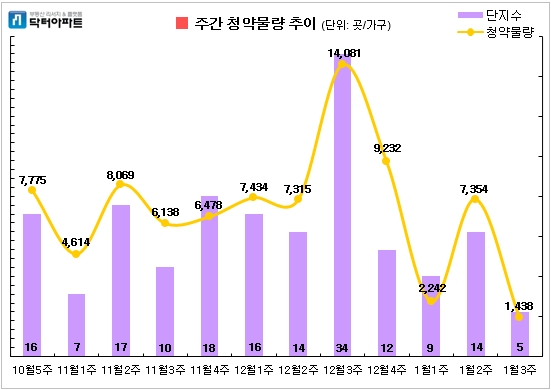 이미지 확대보기11일 부동산 리서치 업체 닥터아파트에 따르면, 1월 셋째 주(1월 13일~1월 18일) 전국의 청약물량은 5곳 1438가구이다. 견본주택 공개 단지는 없으며 당첨자 발표는 16곳, 당첨자 계약은 11곳이다.