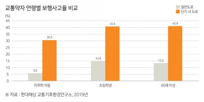 이미지 확대보기6일 교통안전공단에 따르면, 최근 아파트단지 내 교통사고는 일반도로와 비교해 교통약자의 사고 비중이 상대적으로 높은 것으로 나타났다. 특히, 단지 내 미취학아동의 보행사고 비중은 일반도로보다 약 5.25배 월등히 높았다.