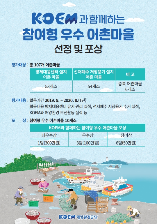 특히, 올해 추진하는 우수 어촌마을은 방제대응센터와 선저페수 저장용기가 설치된 107개소가 대상이며, 1년간(2019년 9월~2020년 8월) 실적을 평가해 선정한다.