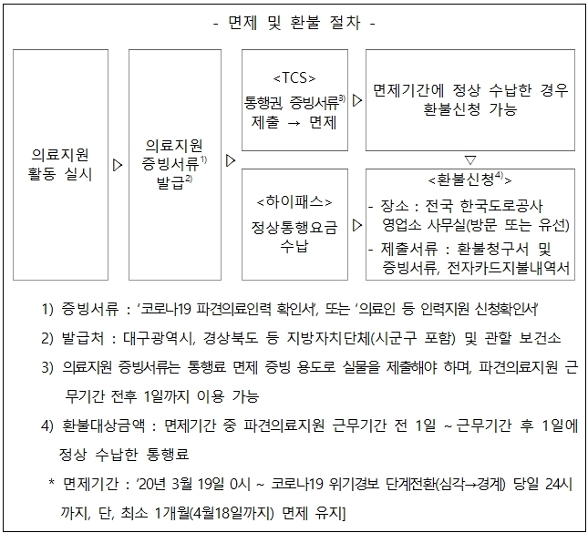 특별재난지역(대구·경산·청도·봉화)에서 의료지원활동을 하는 의료인 운영차량에 대한 통행료는 하이패스 이용차량의 경우 사후환불 방법으로 면제하고, 현금차로 이용차량은 출구 요금소에서 의료지원증빙서류를 제출하는 방법으로 면제한다.
