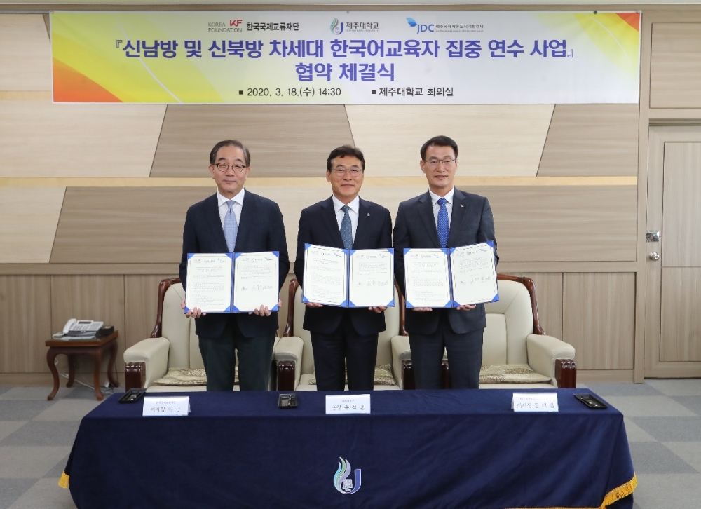 이미지 확대보기20일 JDC에 따르면, 센터는 18일 제주대학교에서 한국국제교류재단, 제주대학교와 '신남방·신북방 차세대 한국어 교육자 집중연수사업' 시행을 위한 업무협약을 체결했다.