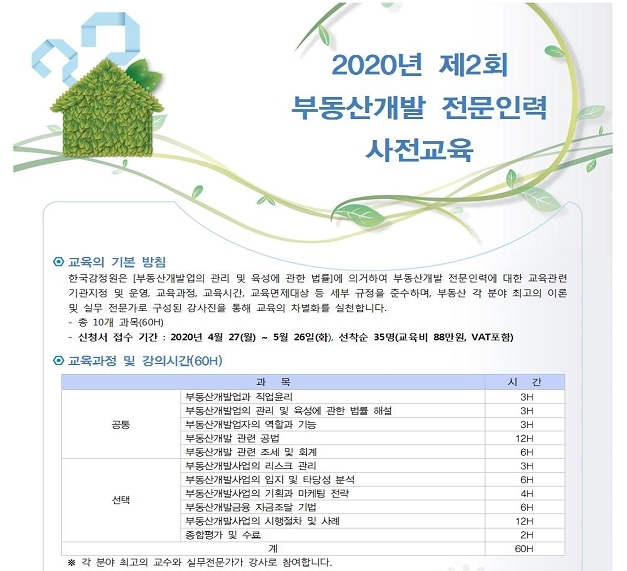 교육대상은 '부동산개발업의 관리 및 육성에 관한 법률 시행령'에 따른 부동산개발 전문인력(변호사, 회계사, 공인중개사 등)이다.