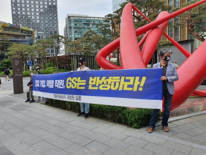 이날 조합원들은 “GS건설이 자신들과 특수관계에 있는 회사의 마감재 사용을 강요해 시장의 공정경쟁 질서를 훼손했다”는 내용의 현수막을 준비해 집회 장소에 내걸기도 했다.