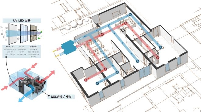 이미지 확대보기10일 대림산업에 따르면 이 시스템은 공기청정형 환기시스템에 자외선 발광다이오드(UV LED) 광촉매 모듈을 탑재해 바이러스를 제거한다. UV LED는 인체와 환경에 미치는 부작용은 적은 대신 살균 효과는 우수한 것으로 알려졌다.