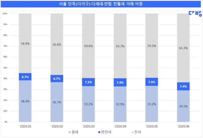 다방이 서울지역 단독(다가구)·연립·다세대 주택 전월세 국토교통부 실거래가를 분석한 자료에 따르면, 전체 전월세 거래 중 전세계약 비중은 올해 ▲1월 54.9% ▲2월 56.6% ▲3월 59.6% ▲4월 59.7% ▲5월 59.2% ▲6월 63.3%로 계속 높아졌다.