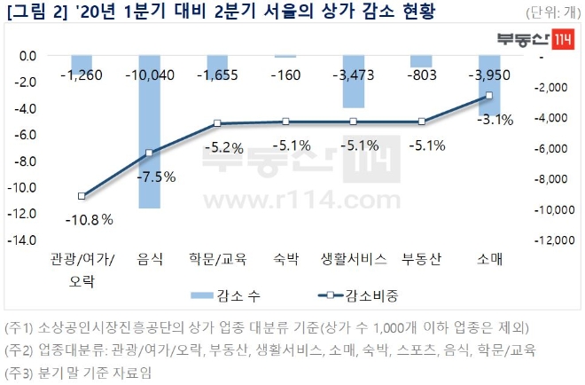 2분기에 이어 3분기에도 서울의 상가 수는 감소세를 이어갈 것으로 부동산114는 내다봤다. 8월 중순 이후 코로나 재확산에 따라 다중이용시설의 운영이 한시적으로 중단되거나 제한돼, 매출에 타격이 불가피해졌기 때문이다.