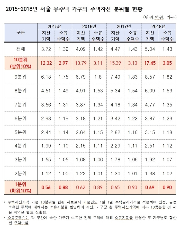 또한, 같은 기간에 평균 소유주택 수도 상위 10%는 2015년 2.97가구에서 2018년 3.05가구로 0.08의 증가 폭을 보인 것과 달리, 하위 10%는 2015년 0.88가구에서 0.90가구로 0.02로 큰 변화가 없었고, 증가 폭도 상위 10%의 4분의 1 수준에 머물렀다.