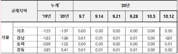 17일 한국감정원의 '주간 아파트 가격 동향' 자료에 따르면, 이달 둘째주(12일 기준) 서울 강남구의 아파트 매매가격 변동률은 -0.01%를 기록했다.