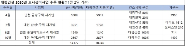 대림건설은 올해 인천 금송구역 재개발사업 수주를 시작으로 ▲대전 삼성1구역 재개발 ▲인천 송월 아파트구역 재개발 ▲대전 옥계2구역 재개발 등 총 4곳에서 시공사로 선정됐다.