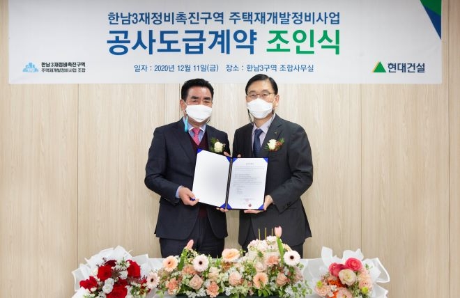 이미지 확대보기현대건설은 지난 11일 한남3재정비촉진구역 재개발조합 사무실에서 조합과 1조7377억원 규모 공사계약을 체결했다고 13일 밝혔다.