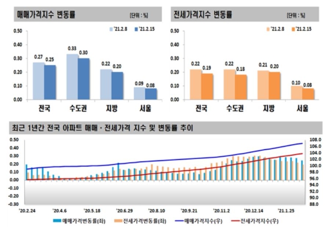 부동산원은 "서울은 2·4 공급대책 발표 후 매수문의 감소와 관망세가 나타나는 가운데, 명절 연휴 등의 영향으로 매수세가 위축되며 상승 폭이 축소했다"고 설명했다.