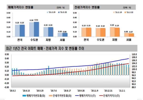 25일 한국부동산원이 발표한 2월 넷째 주(22일 기준) 주간 아파트 가격 동향에 따르면 수도권 아파트 매매가격은 0.31% 올라 지난주(0.30%)보다 상승폭이 커졌다.