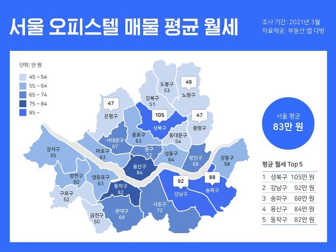 서울 25개 구 중에서 평균 월세가 가장 높은 곳은 성북구(105만 원)였고 강남구(92만 원), 송파구(88만 원), 용산구(84만 원) 등이 상위권을 차지했다. 타 지역에 비해 월세 금액이 상대적으로 적은 곳은 은평구(47만 원)와 중랑구(47만 원)였으며 이 밖에도 노원구(49만 원), 금천구(50만 원), 구로구(52만 원) 등에 타 지역 대비 낮은 가격대의 오피스텔 매물이 등록됐다.