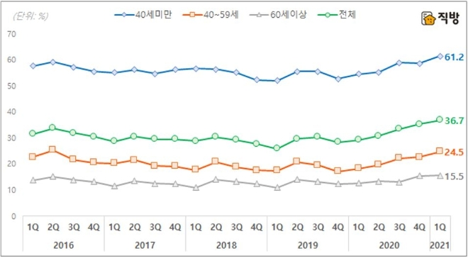 40세 미만의 경우 2015년 1분기 60.7% 이후 처음으로 60% 이상의 비중을 기록했다. 40~59세는 2020년 4분기 0.5%p늘어났지만 2020년 2분기부터 이어지고 있는 50% 이하 비중이 유지되고 있다.