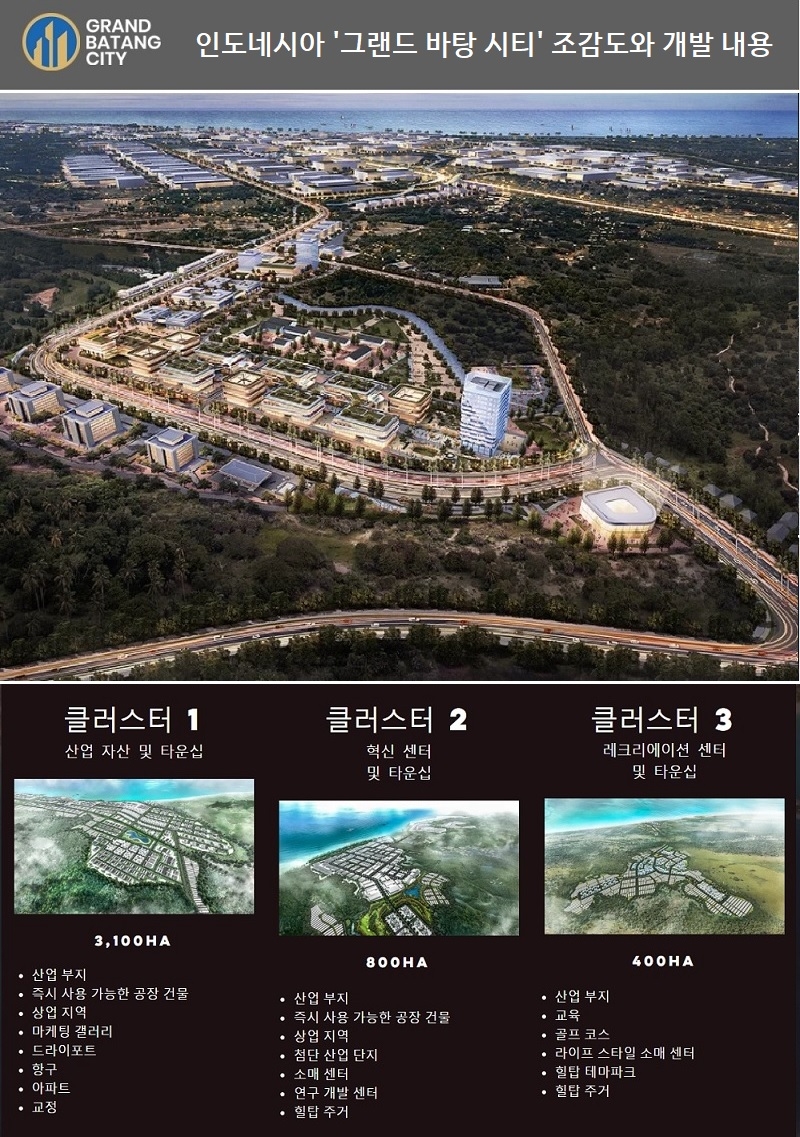 이미지 확대보기그랜드 바탕 시티는 3개 클러스터로 나눠 각 클러스터마다 ▲도로·철도·항만·연구개발(R&D)센터·첨단산업단지·발전소 등 산업인프라 ▲쇼핑센터아파트골프장 등 주거편의 인프라 ▲병원·경찰서·소방소·모스크(이슬람사원)·교육 등 공공인프라를 균형있게 배치될 계획이다.