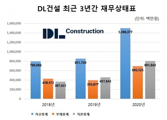 DL건설의 부채비율은 ▲2017년 139.3% ▲2018년 116.6% ▲2019년 86.0% ▲2020년 86.9%로 감소세를 보이고 있다.