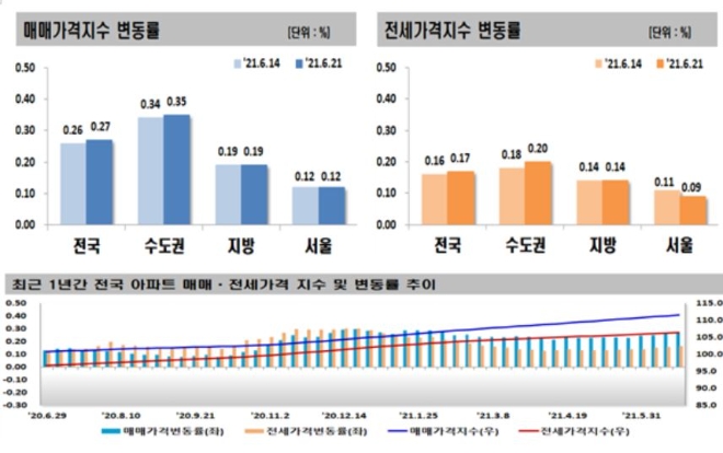 이미지 확대보기24일 한국부동산원이 발표한 6월 셋째 주(21일 기준) 주간 아파트 가격 동향에 따르면 수도권 아파트 매매가격은 0.35% 올라 지난주(0.34%)보다 상승폭이 늘었다.