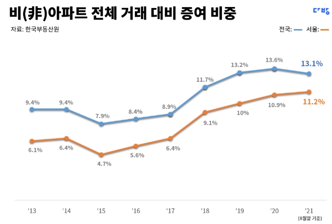 부동산원이 빌라와 단독·다가구 매매 통계 집계를 시작한 2013년만 해도 전체 주택 거래에서 증여가 차지하는 비중은 9.4%에 그쳤고, 주택 시장이 지금보다 부진했던 2015년에는 7.9%까지 내려앉았다. 그러나 2018년 비아파트 증여 비중은 11.7%로 커졌고, 2019년(13.2%)과 2020년(13.6%)에 이어 올해도 13%대를 기록 중이다.