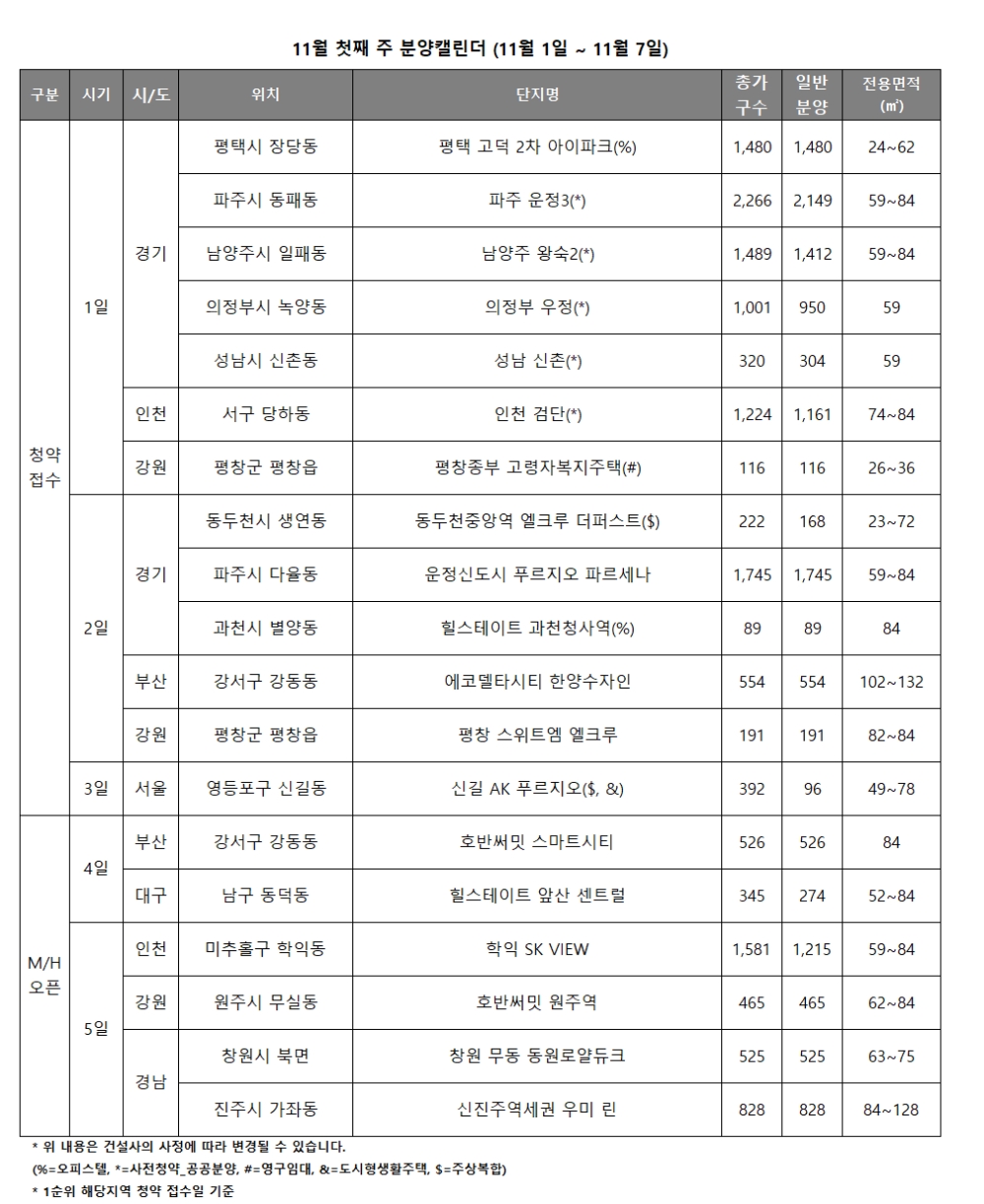 [분양캘린더 11월1주] 경기·인천 공공분양 일반공급 청약 시작...전국 13곳 1만 415가구 공급
