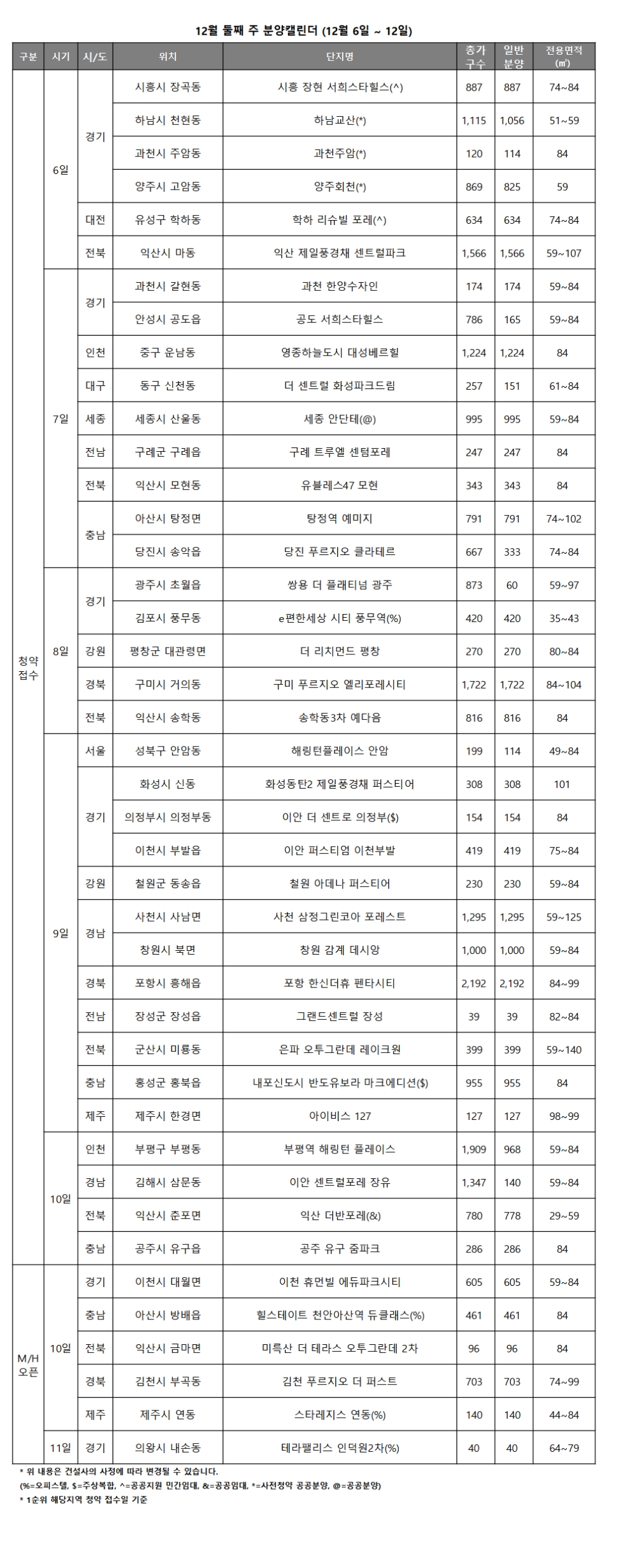 이미지 확대보기4일 리얼투데이에 따르면 12월 둘째주에는 전국 36곳에서 총 2만2197가구(오피스텔·공공분양·사전청약 공공분양·공공지원 민간임대 포함, 행복주택 제외)가 분양을 시작한다.