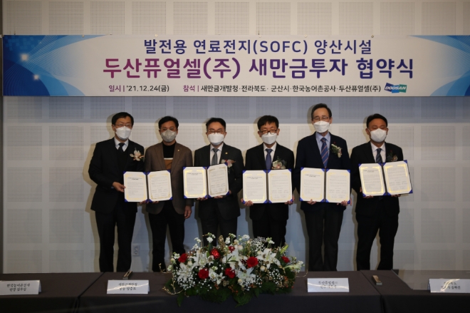 이미지 확대보기새만금개발청은 24일 한국농어촌공사, 전라북도, 군산시와 함께 새만금 국가산단에 두산퓨얼셀㈜의 '발전용 연료전지 양산시설' 건립을 위한 투자협약을 체결했다.