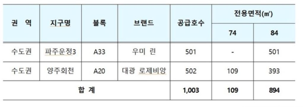 이미지 확대보기우선 이번 사전청약은 파주 운정3 A33 블록(우미린) 501세대(전용 84㎡ 501세대), 양주 회천 A20 블록(대광 로제비앙) 502채(전용 74㎡ 109세대·전용 84㎡ 393세대) 규모로 진행된다.