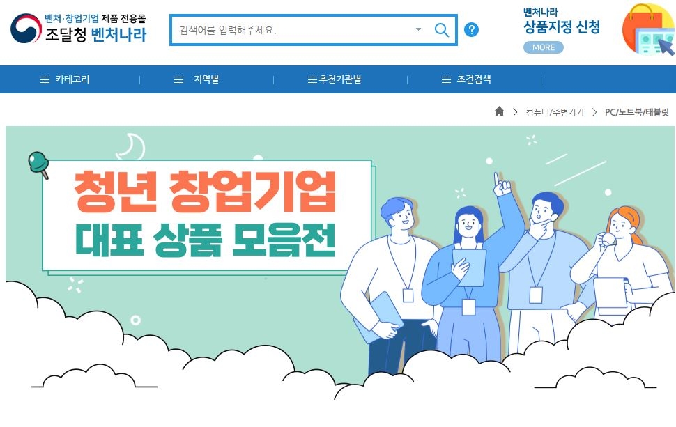 이미지 확대보기조달청의 창업기업 전문 쇼핑몰 '벤처나라'는 벤처기업 전용 쇼핑몰로서, 우수한 기술·품질에도 불구하고 공공조달시장 진입에 애로를 겪고 있는 창업·벤처기업을 대상으로 한다. 이들 기업의 초기 판로지원과 공공 조달시장 진입을 촉진하기 위해 조달청이 구축·운영 중이다.
