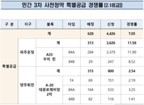 이미지 확대보기한국부동산원 청약홈에 따르면 민간 3차 사전청약 특별공급 청약 마감 결과 총 628가구 모집에 4426명이 신청했다. 평균 경쟁률은 7.05대1이다.