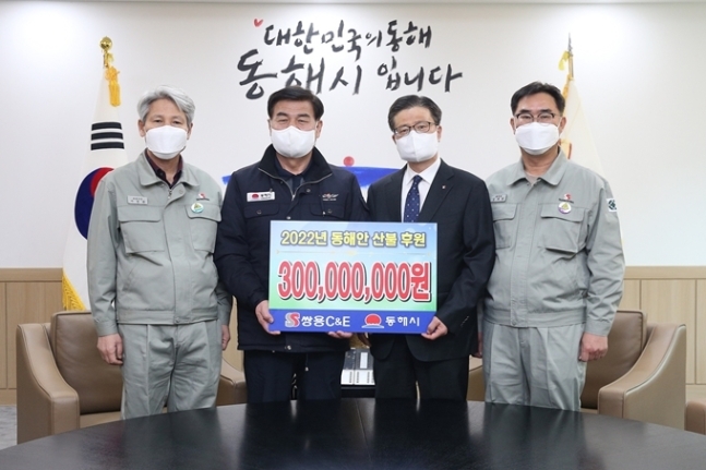 이미지 확대보기이현준 쌍용C&E는 사장은 7일 동해시청을 방문해 산불진화와 복구에 힘쓰고 있는 심규언 동해시장을 만나 복구지원 성금 3억원을 전달했다