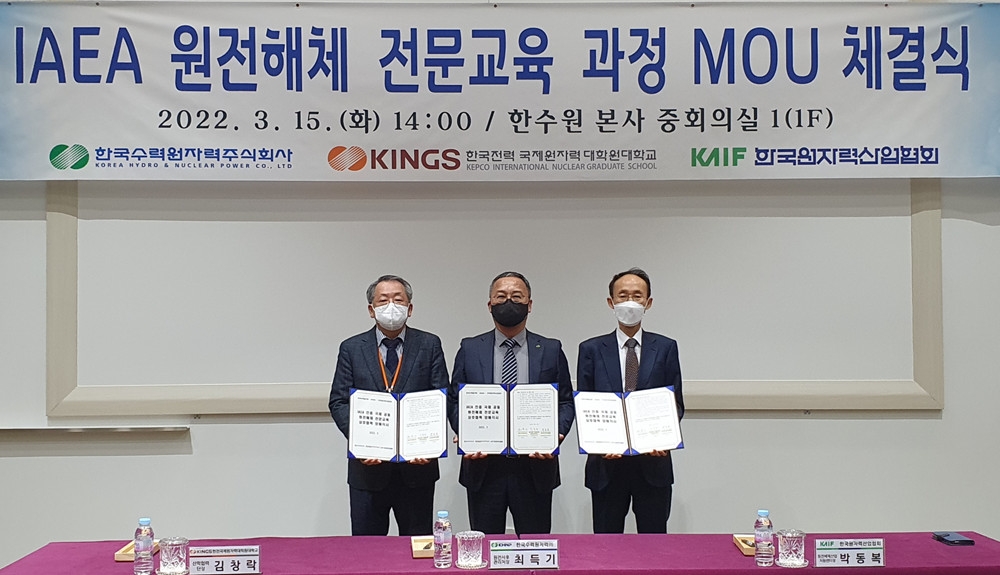 이미지 확대보기한수원 최득기(가운데) 원전사후관리처장·KINGS 김창락(왼쪽) 산학협력단장·한국원산 박동복 원전해체산업지원센터장이 원전해체 전문교육 과정 개설을 위한 MOU를 체결한 후 기념촬영을 하고 있다. 사진=한수원 한국수력원자력(한수원)·한국전력 국제원자력 대학원대학교(KINGS)·한국원자력산업협회(한국원산) 등 원자력 관련 기관은 ‘IAEA 인증 원전해체 전문교육 과정 개설을 위한 양해각서(MOU)’를 체결했다.